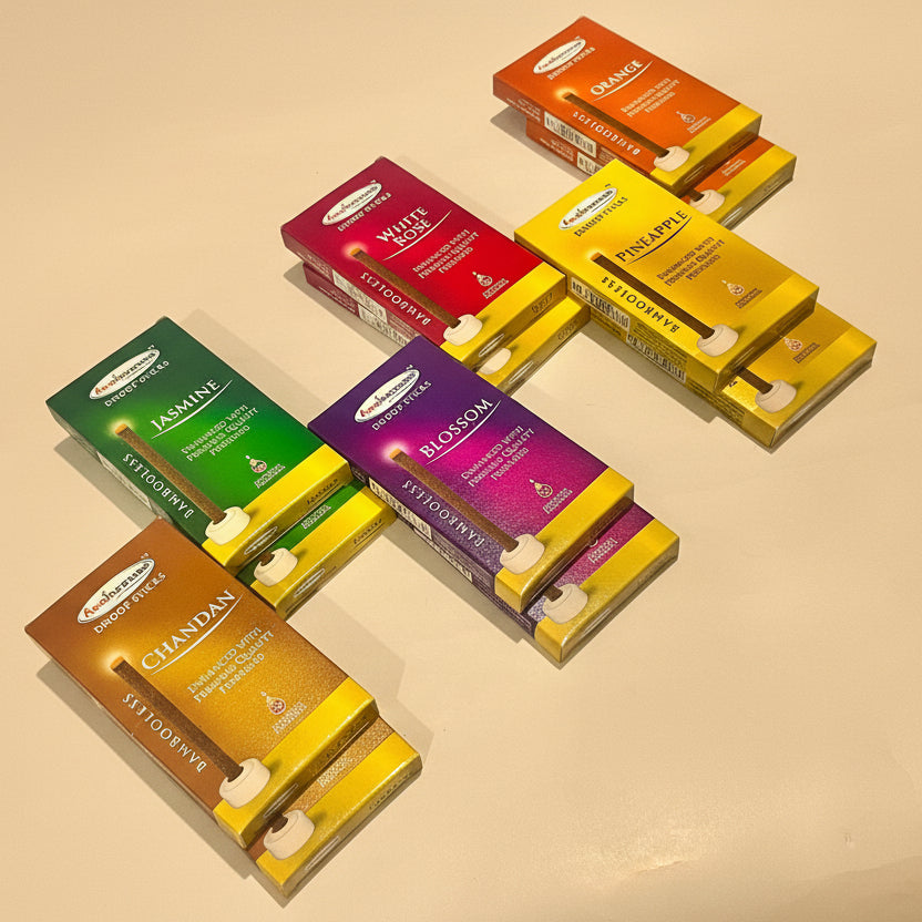 Aroincense BAMBOOLESS Dhoop Sticks offer a pure, smoke-enriched aroma without the use of bamboo cores, ensuring a cleaner and longer-lasting experience. Each pack contains 12 sets of 10 sticks, crafted to enhance your environment with rich, natural fragrances ideal for meditation, relaxation, or spiritual rituals. These dhoop sticks burn evenly, releasing a soothing scent that creates a calming atmosphere without the typical stick residue. Perfect for those seeking high-quality, traditional incense with a modern, eco-friendly twist.