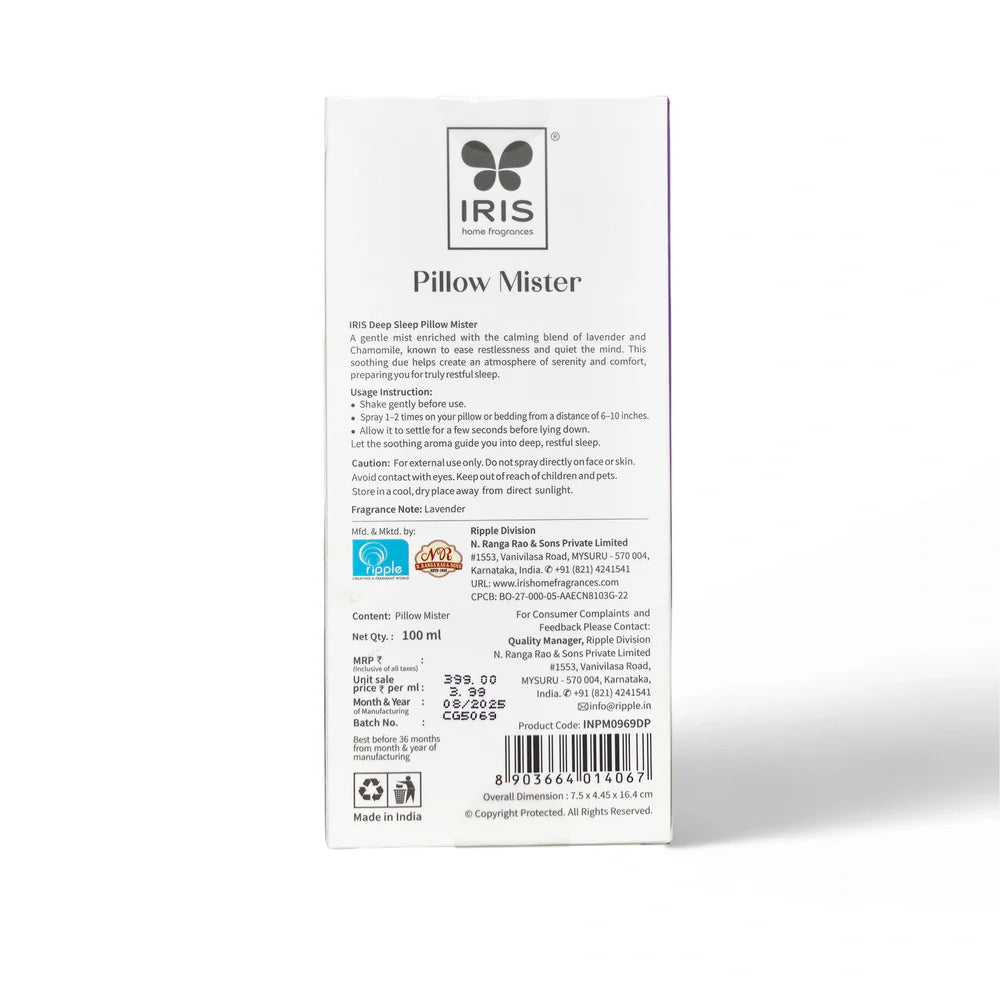 Transform your sleep sanctuary with IRIS Deep Sleep Pillow Mister, a carefully formulated 100 ml spray designed to enhance your nightly rest. Infused with calming botanicals and aromatherapeutic essences, this pillow mister creates an environment conducive to deeper, more restorative sleep. Simply spritz onto your pillow and bedding before sleep to experience a soothing sensory ritual that helps quiet the mind and ease tension. The lightweight formula dries quickly without leaving residue, making it an effortless addition to your bedtime routine. Perfect for those seeking natural support for better sleep quality and relaxation.